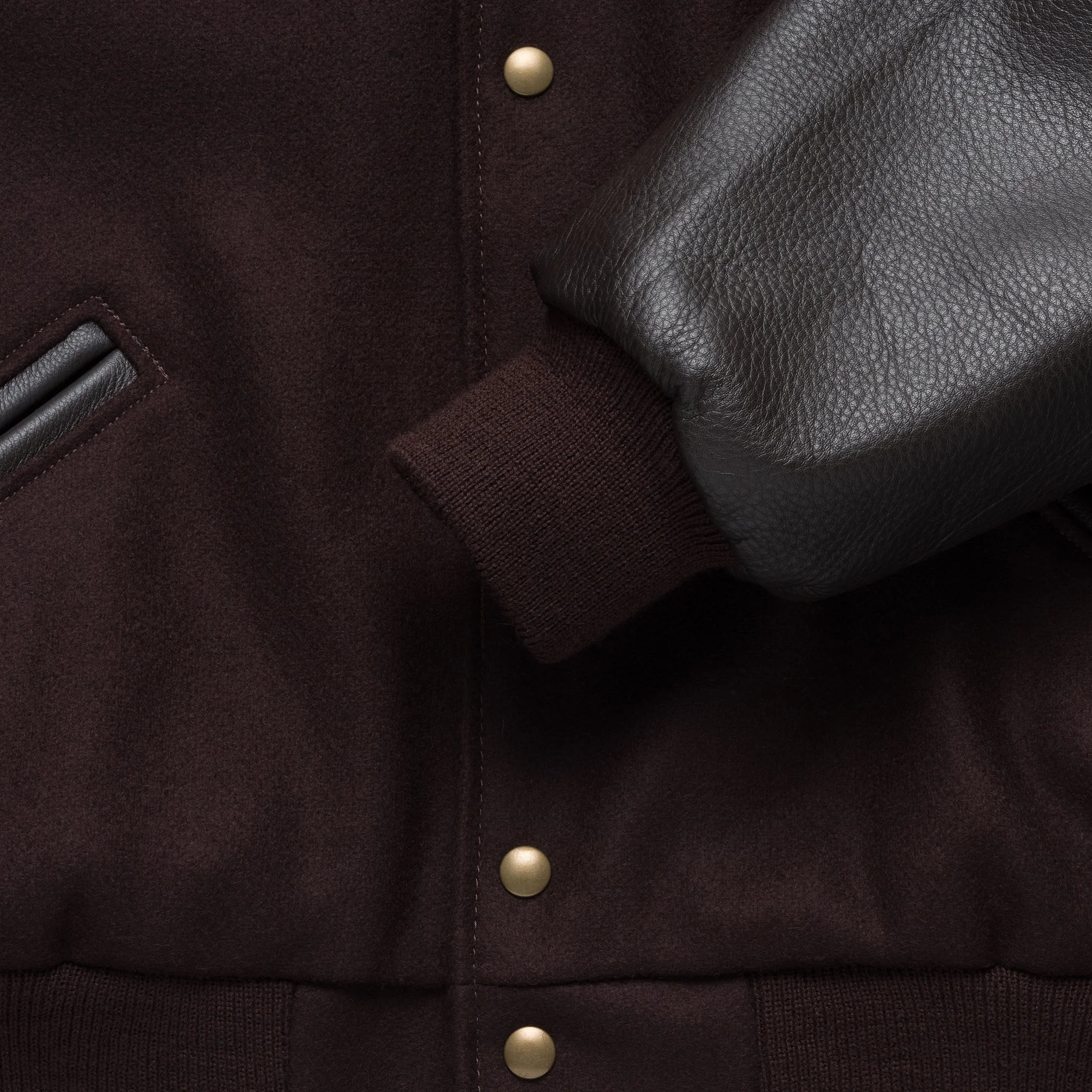 We stripped the jacket down — removing the traditional stripes and contrast details — to create a clean, monochromatic version designed to outlast trends and adapt to any wardrobe. A custom neck label, inspired by 1950s apparel tags, was developed exclusively for the collaboration — a subtle nod to vintage craftsmanship that gave the piece its own distinct identity. The result: a rich espresso wool body with cowhide sleeves, antiqued brass snaps, and subtle tonal accents that make it versatile and timeless.