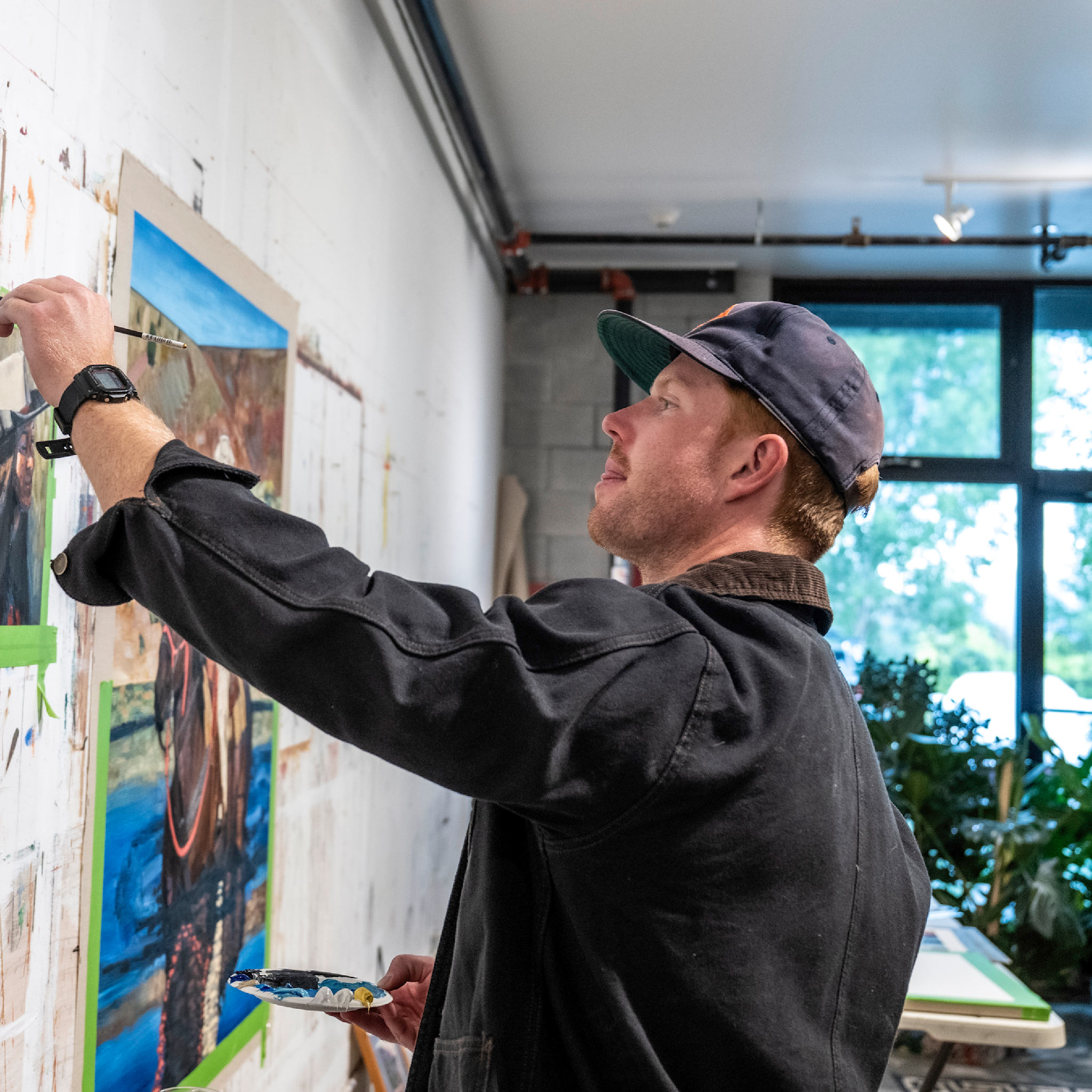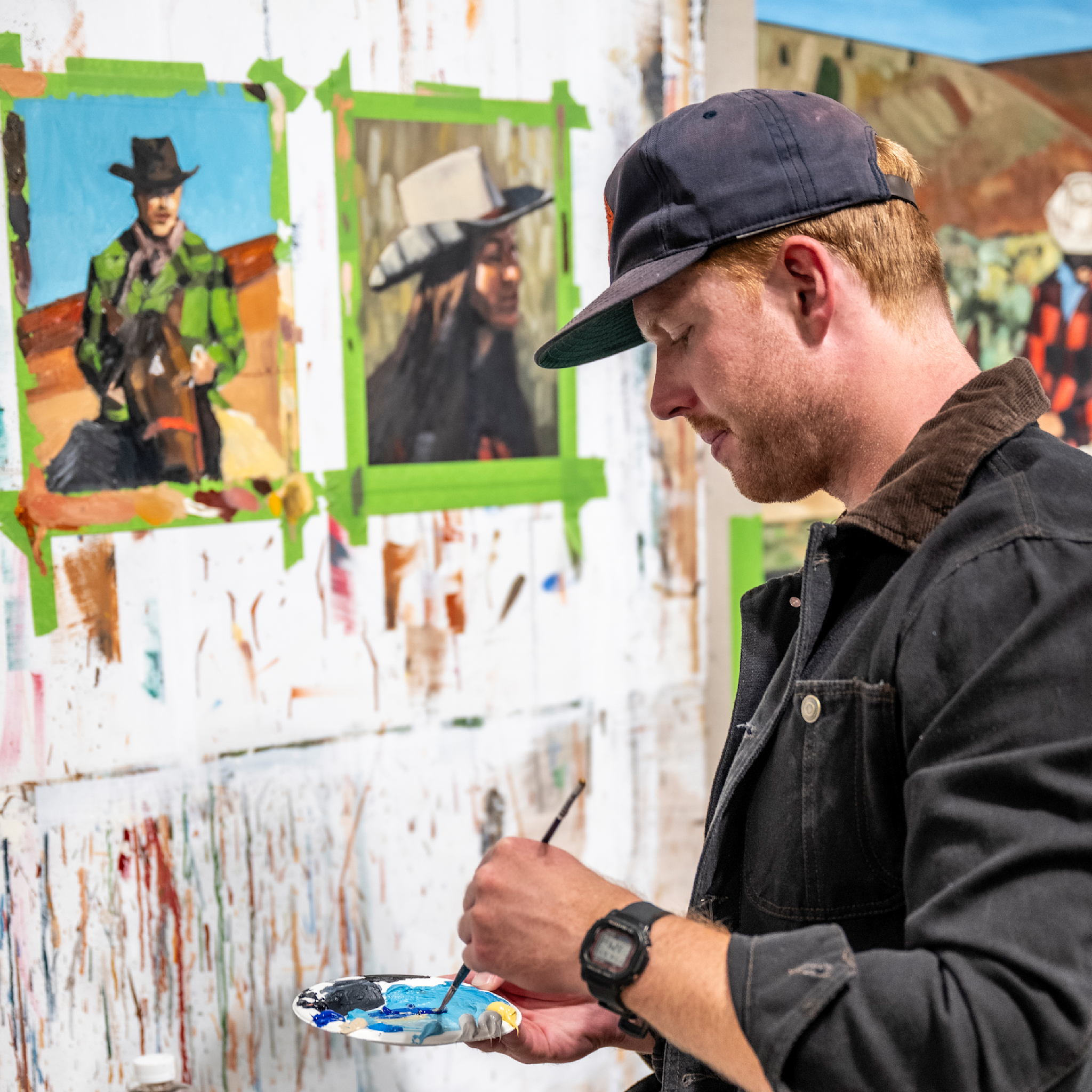 A modern portrait of the American West. This limited-edition capsule spotlights the work of Connor Liljestrom, the Jackson, Wyoming–born artist redefining Western iconography through a contemporary lens. Known for his large-scale oil and mixed media works, Liljestrom captures the tension between myth and memory — where grit, glamour, and Americana collide.