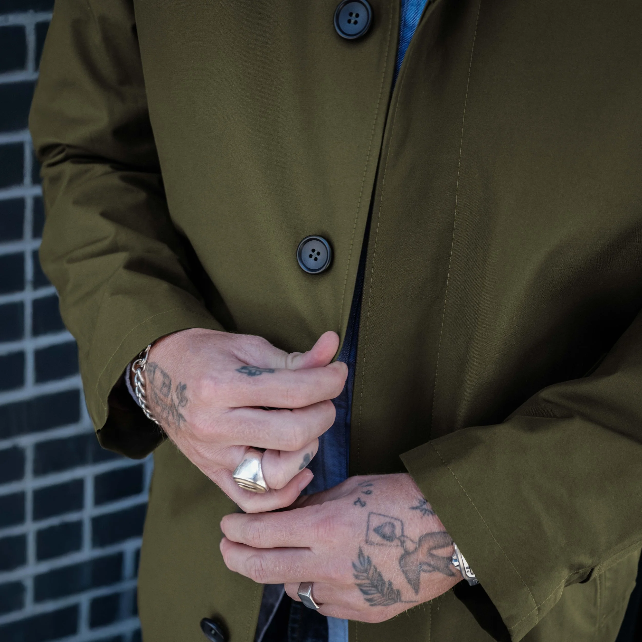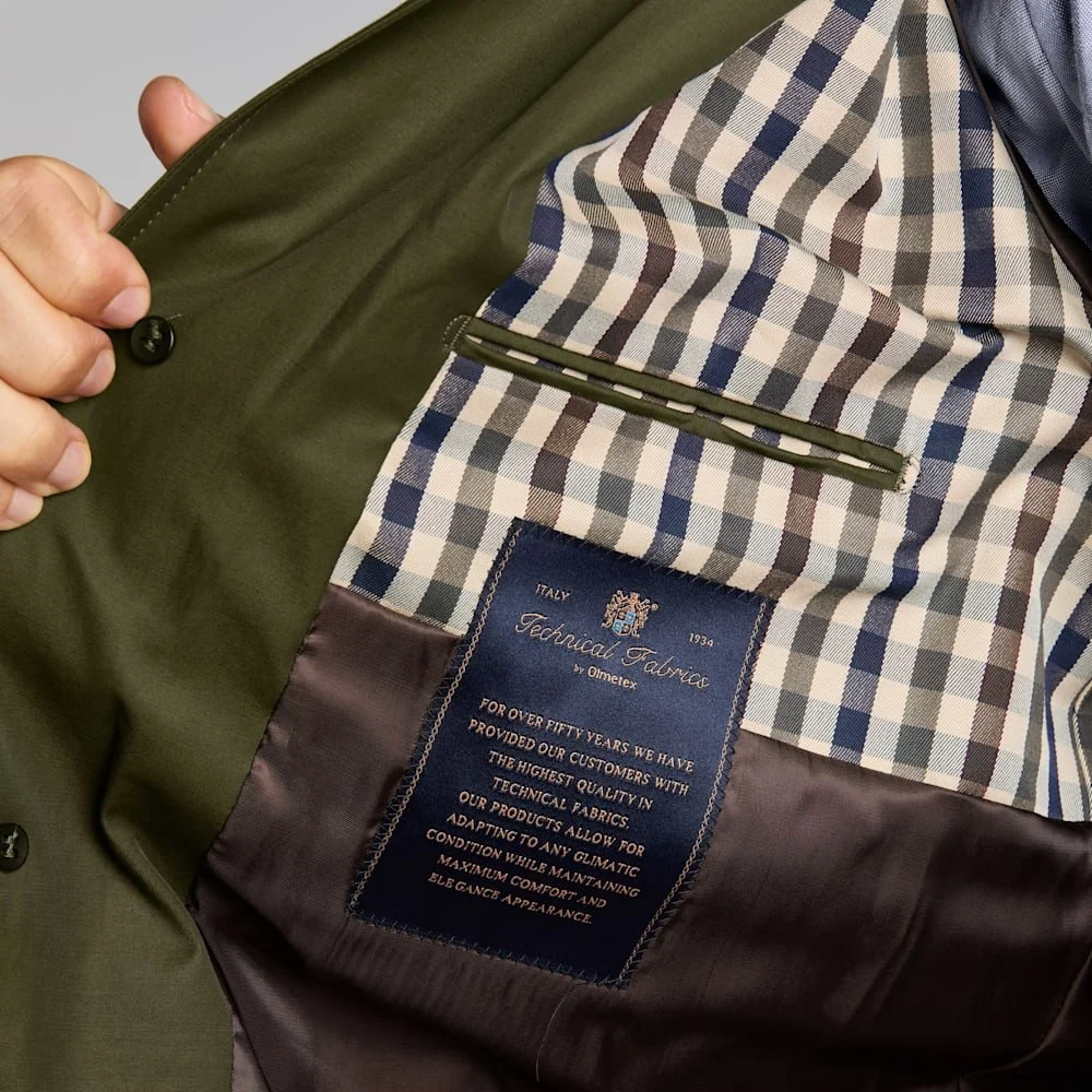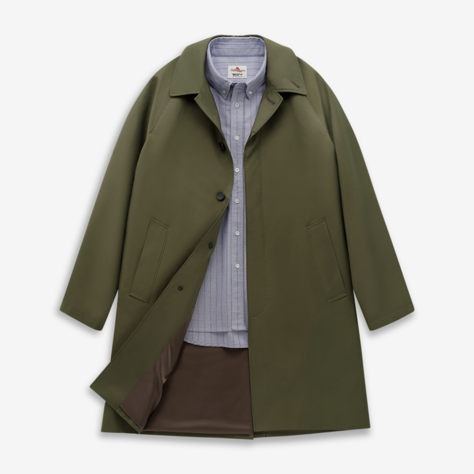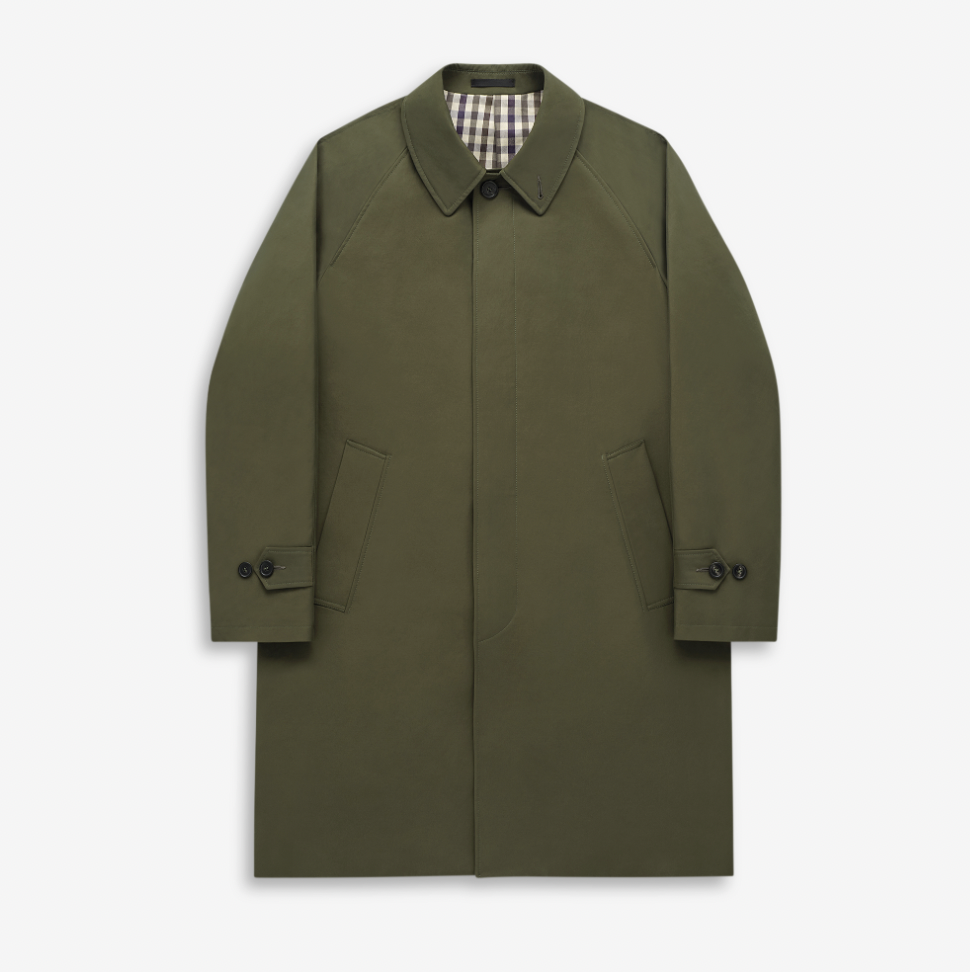 The trench, cut from tightly woven water-repellent cloth by Olmetex Mills of Italy and tailored in a Portuguese factory specializing in overcoats since the 1950s, was made exclusively in an Olive Moss colorway with a custom heavyweight plaid lining and horn buttons — a modern heirloom built for decades of wear.