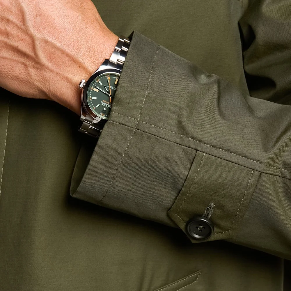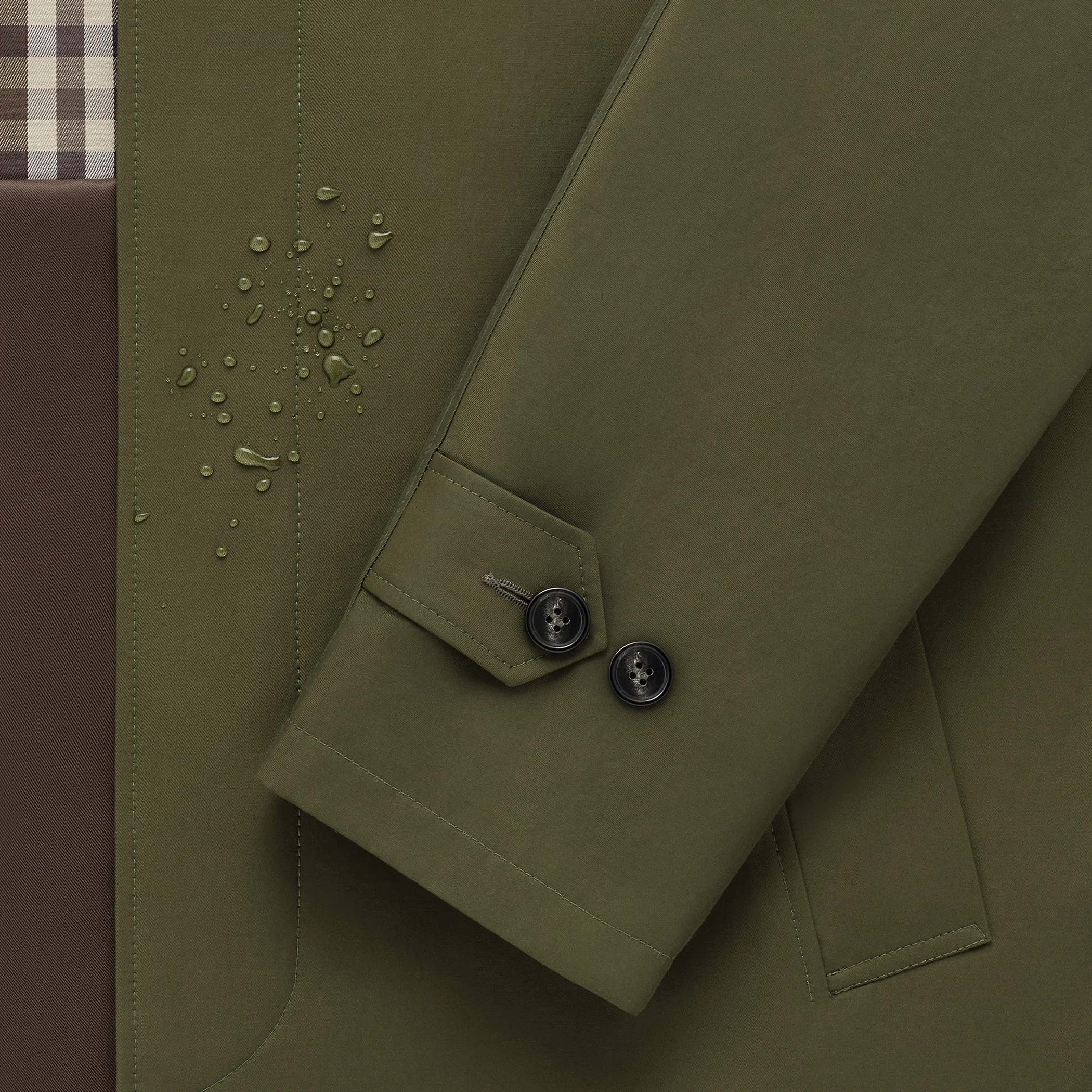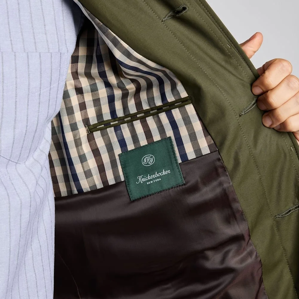 The trench, cut from tightly woven water-repellent cloth by Olmetex Mills of Italy and tailored in a Portuguese factory specializing in overcoats since the 1950s, was made exclusively in an Olive Moss colorway with a custom heavyweight plaid lining and horn buttons — a modern heirloom built for decades of wear.