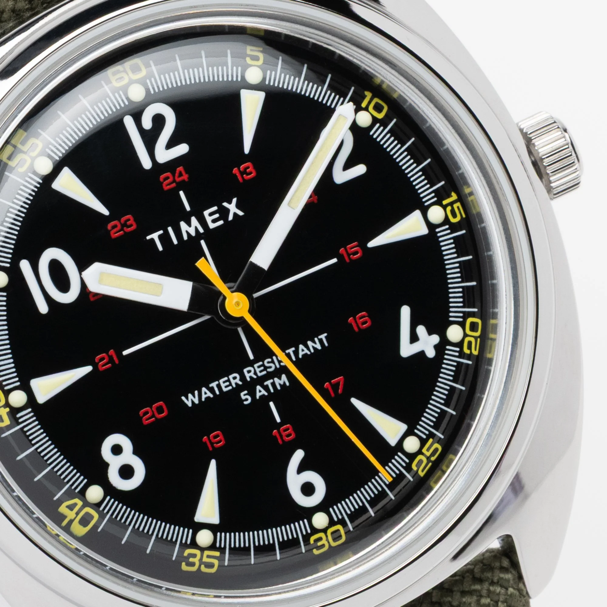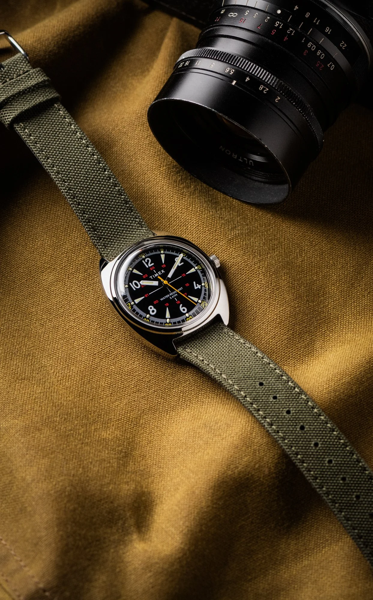 Inspired by Timex’s 1970s-era Viscount, the Bespoke Post × Timex Field Watch reimagined an archive classic with a larger 36mm case and a colorful, luminescent dial that nods to its vintage roots. We paired it with a dual-sided CORDURA® and leather strap for a mix of durability and comfort, and added subtle Bespoke Post branding to the crown and caseback.